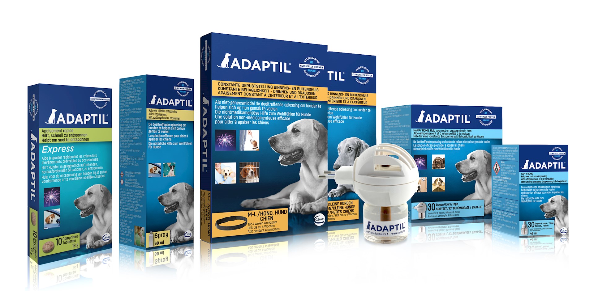 Adaptil is verkrijgbaar als halsband, tablet, verdamper en spray.