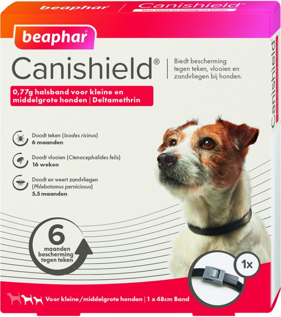Deze band beschermt honden langdurig in de strijd tegen parasieten. Dood teken gedurende 6 maanden; Dood vlooien gedurende 16 weken; Dood en weert zandvliegen gedurende 5,5 maanden. Canishield® 0.77g (deltamethrin) halsband voor kleine en middelgrote honden. Canishield® 1.04g halsband voor grote honden.